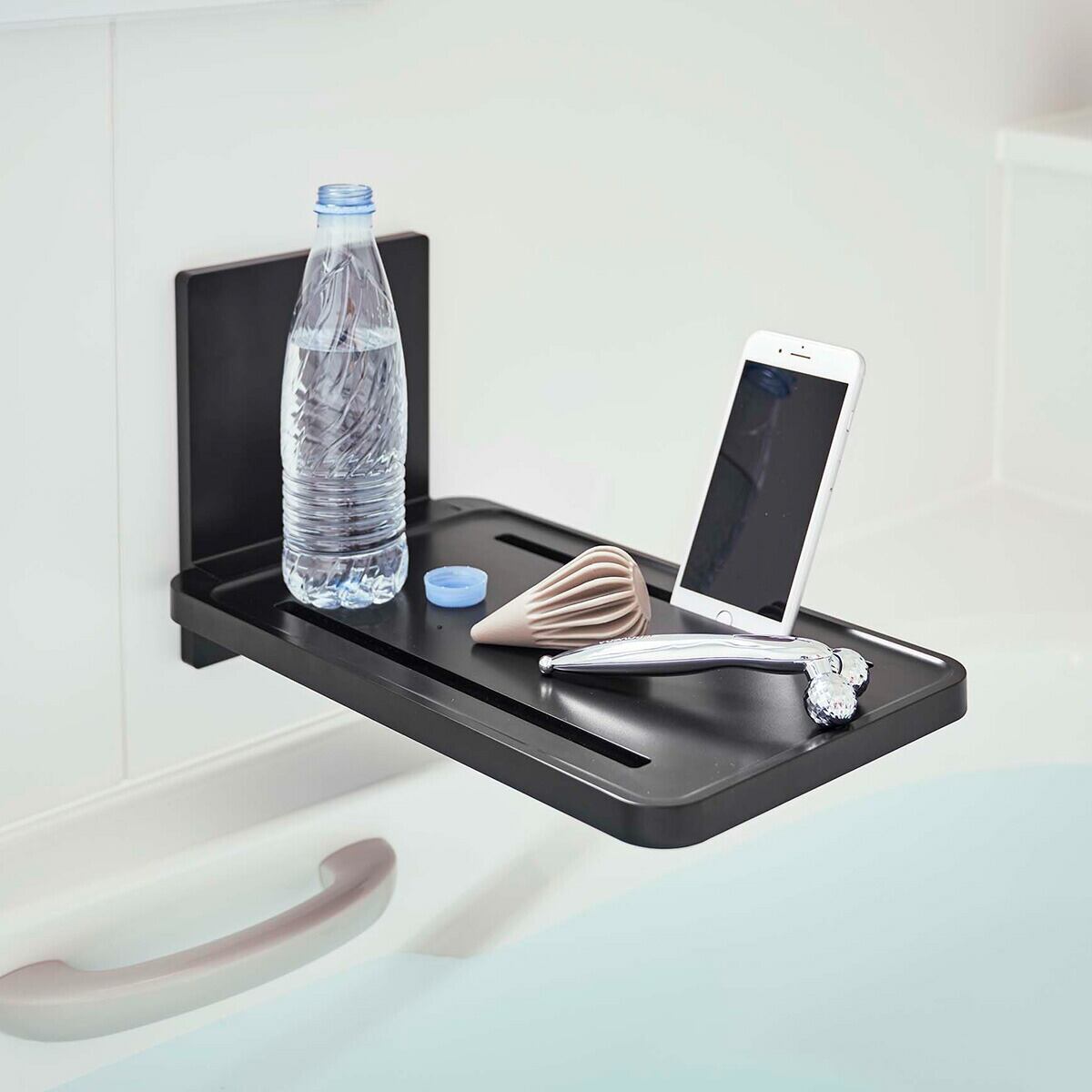 浴室壁面にフィルムフックで付けるだけ!ペットボトル、健康グッズなどの一時置きやスマートフォン・タブレットPCなどを鑑賞しながらリラックスタイムを楽しむ折り畳み式の棚。