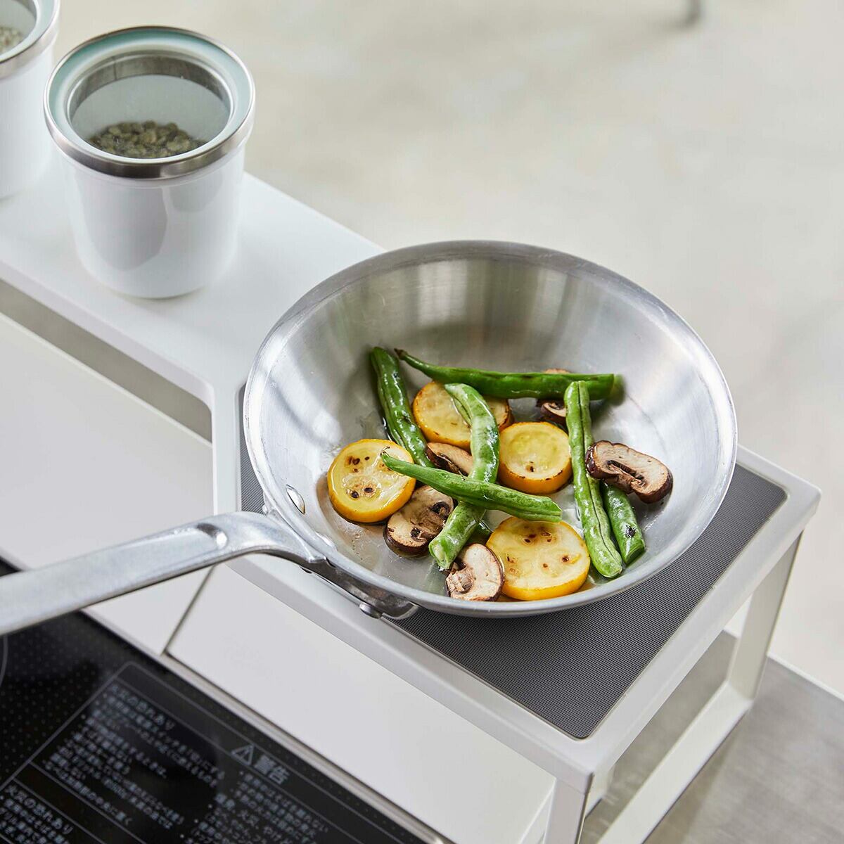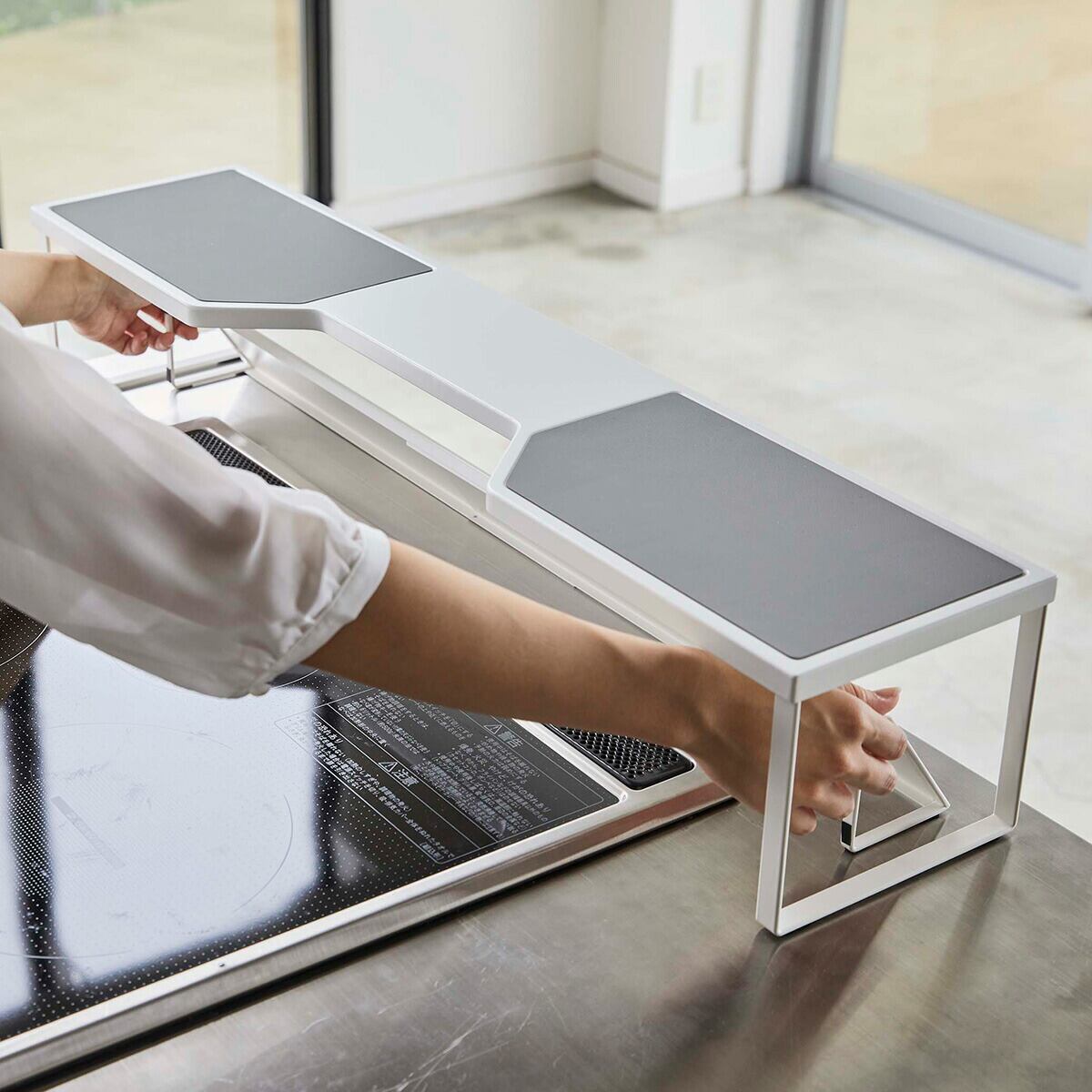 高さがあるのでグリル使用時の排気口カバーの移動も簡単。鍋やフライパンも置ける熱に強く滑りにくいシリコーンマット付き。