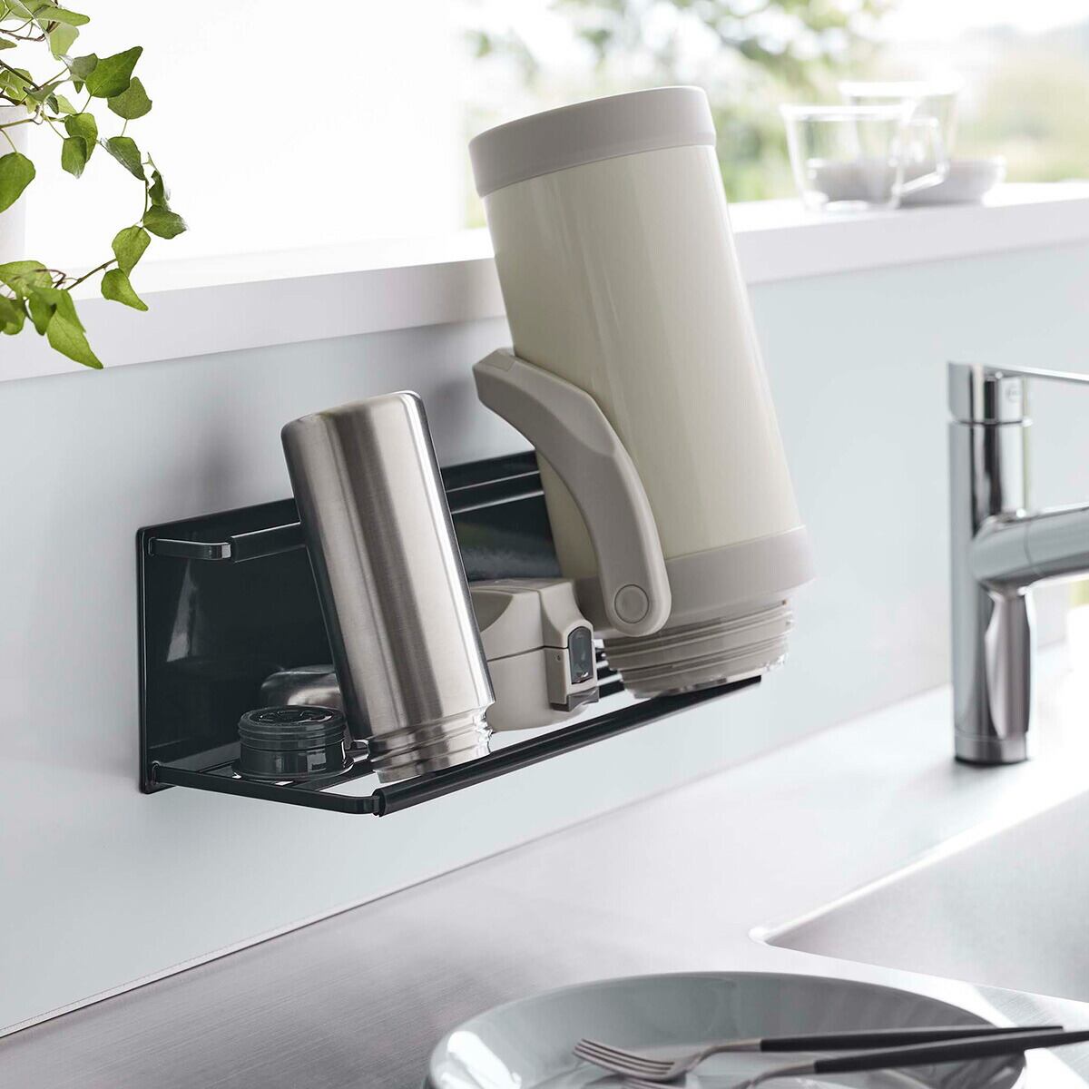 強力マグネットでキッチンパネルに簡単取り付けが可能なボトルホルダーです。マグボトルからジャグボトルまでサッと干せます。ラック部は奥行きがあるので、収納物の後ろはキャップやパッキンなどの小物も一緒に干せます。
