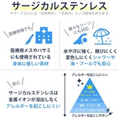 素材は医療用工具のメスやハサミにも使用されているサージカルステンレスを使用していますので、金属アレルギーの方でも比較的安心してご使用頂けます。