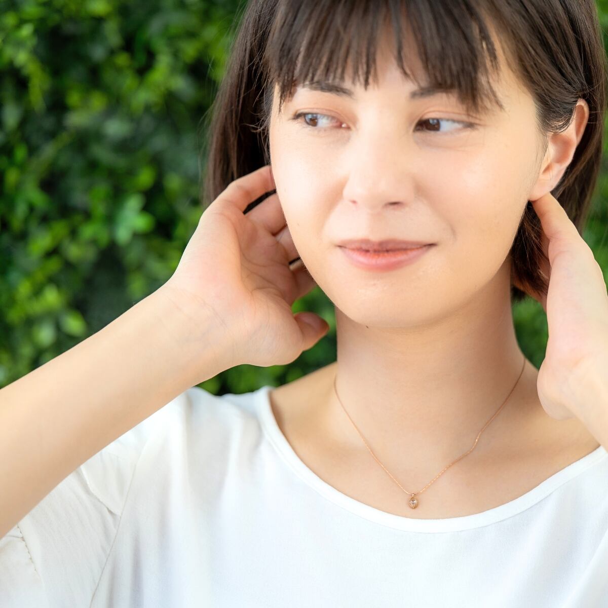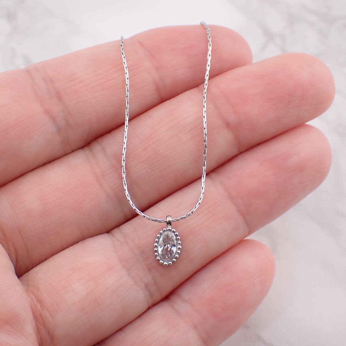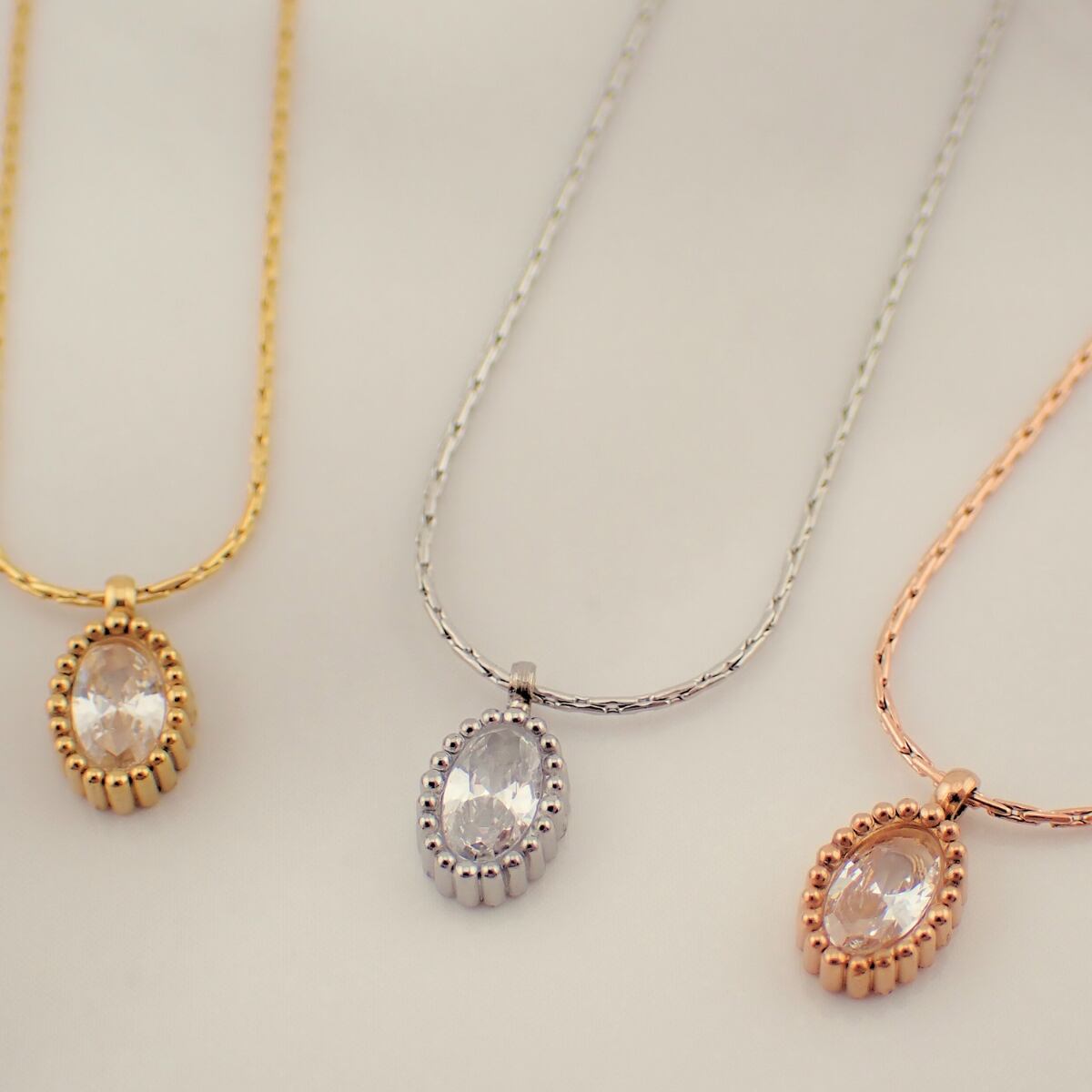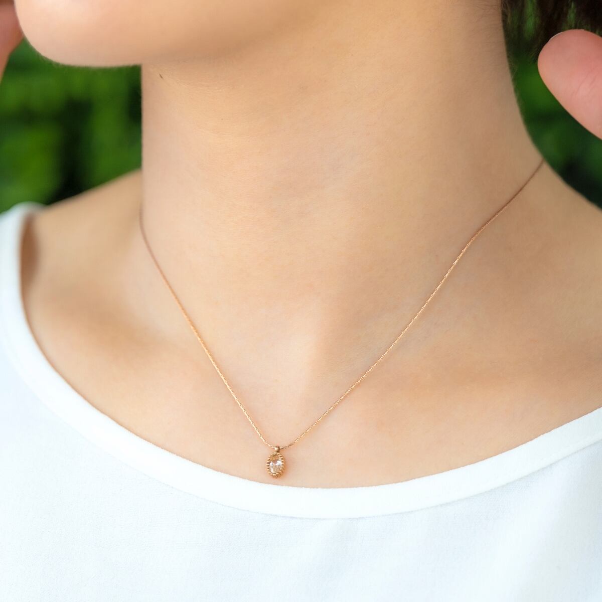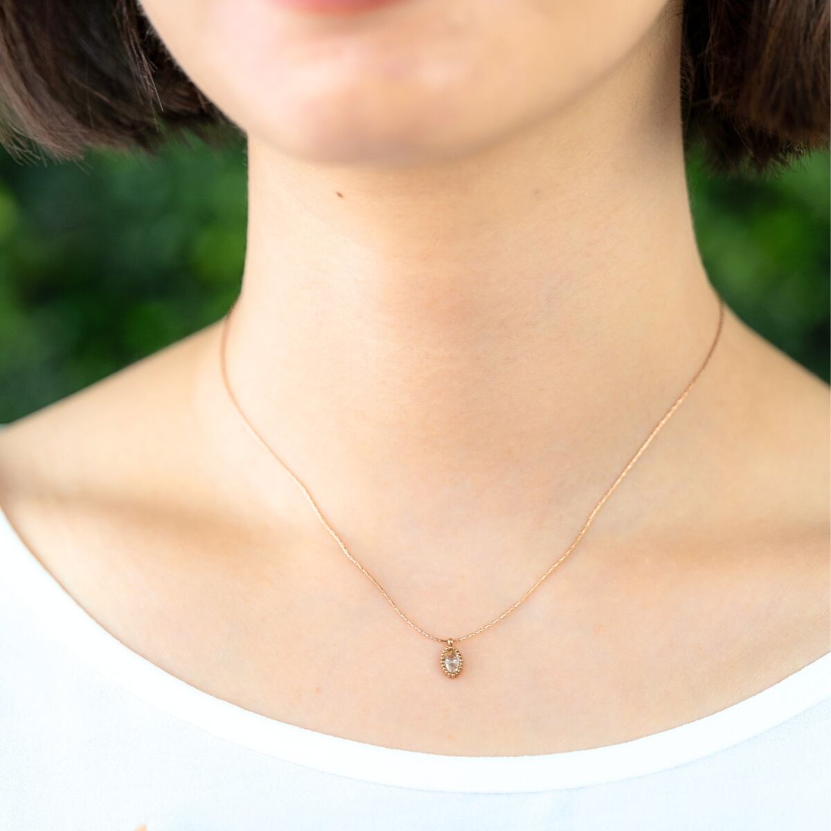 しずく型のストーンが胸元で繊細にきらめく、