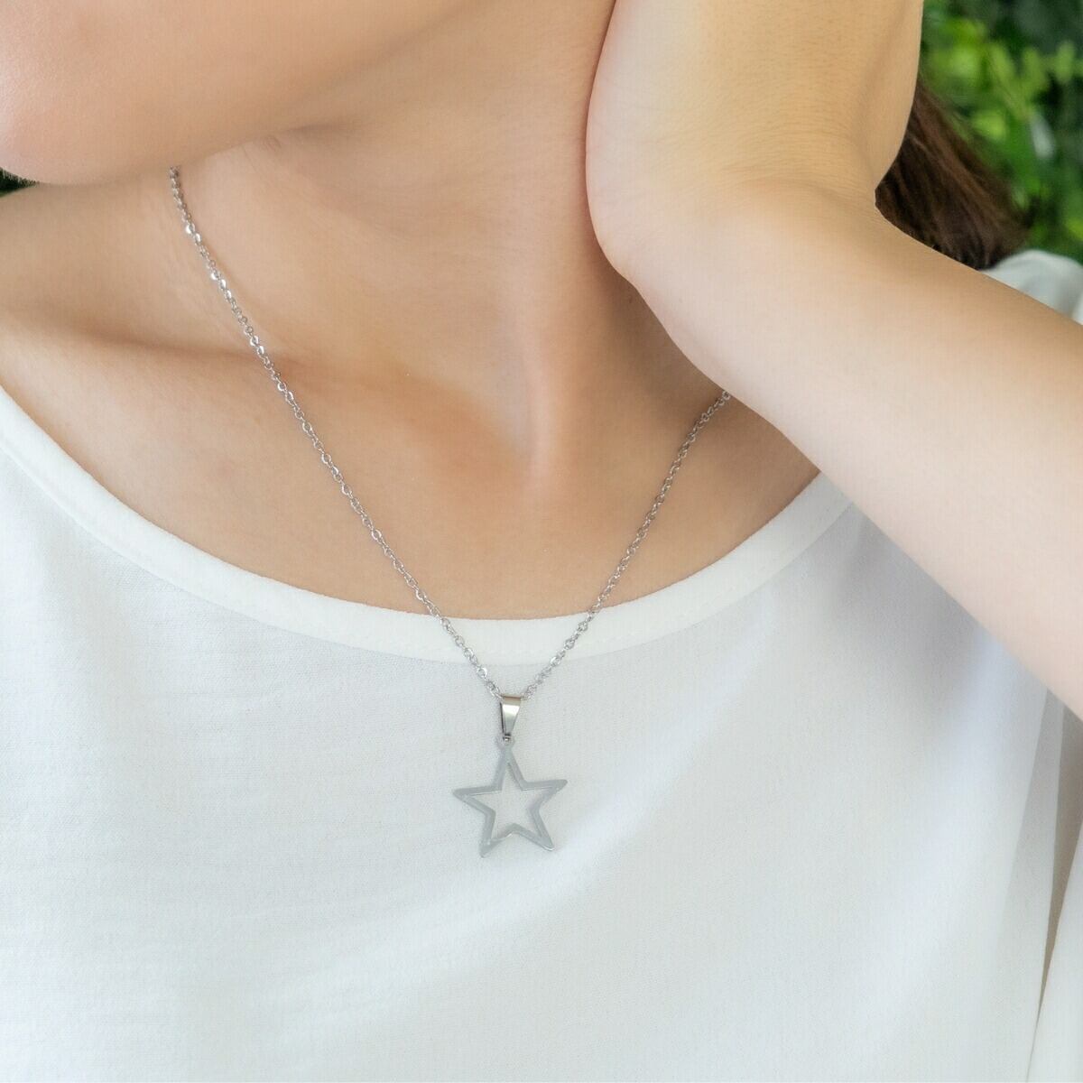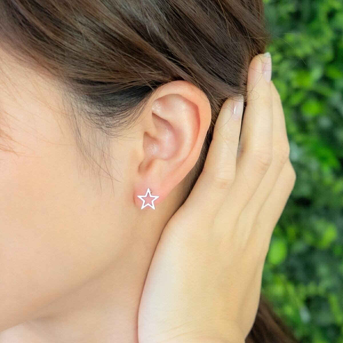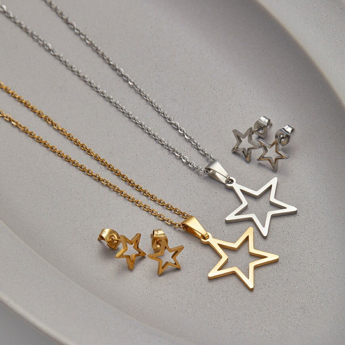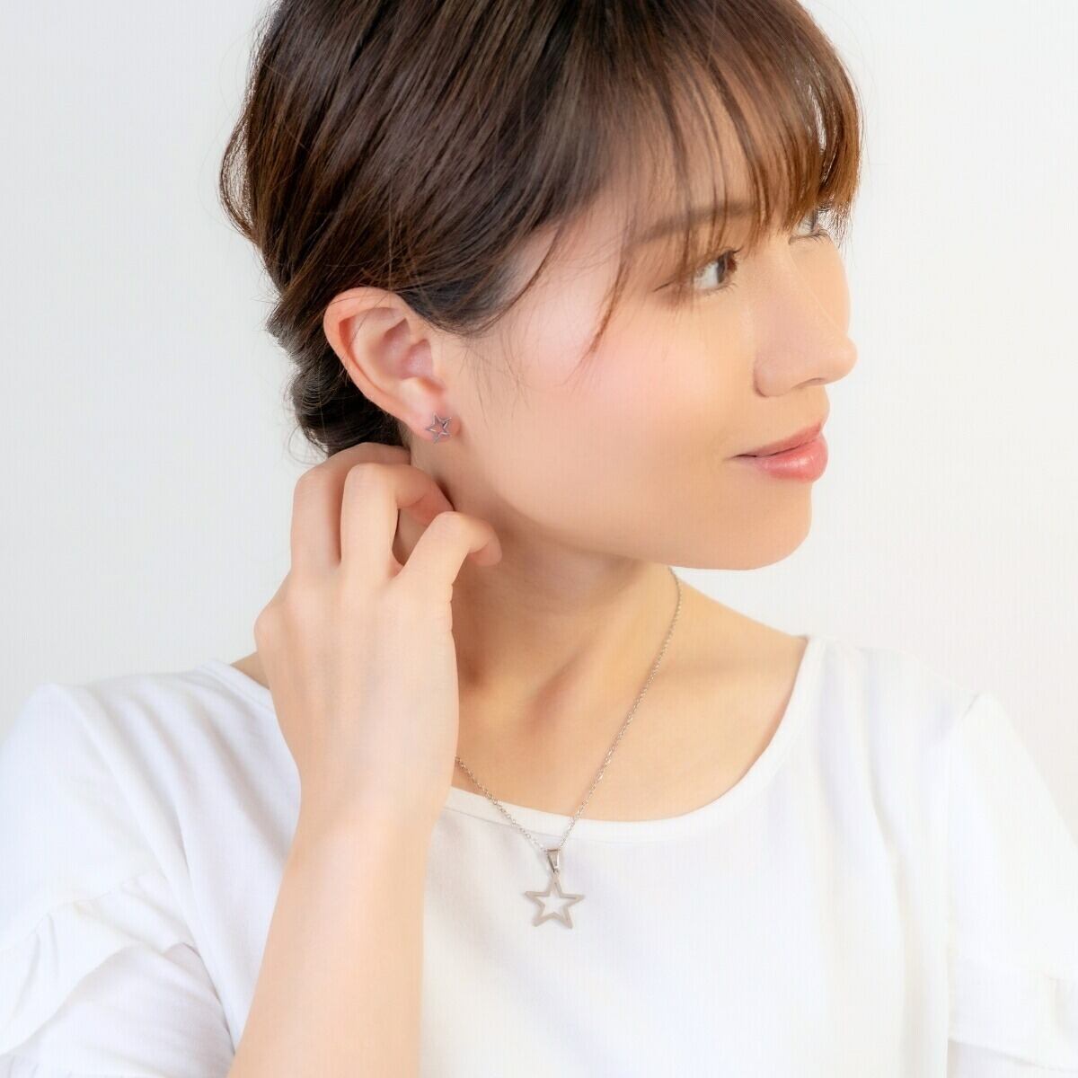 小ぶりな星型のピアスと、大きめの星モチーフが目を引くネックレスの組み合わせで、耳元と胸元をさりげなく華やかに演出します。