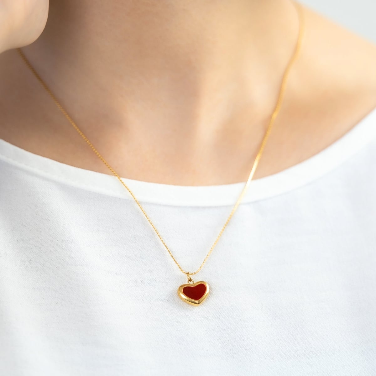 艶やかなレッドとゴールドのハートモチーフが胸元に映える、