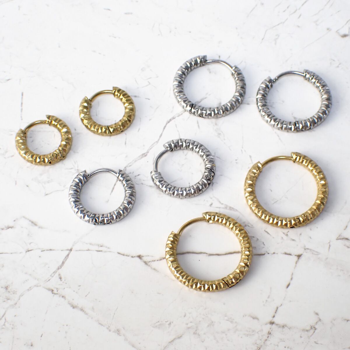 光と影が交差するような立体的なカット模様が印象的なフープピアス。