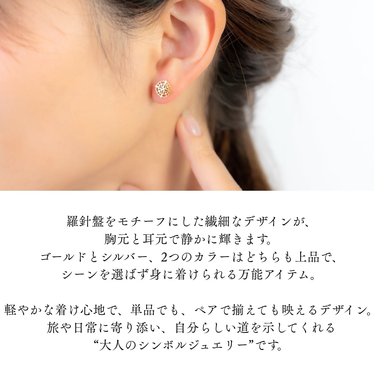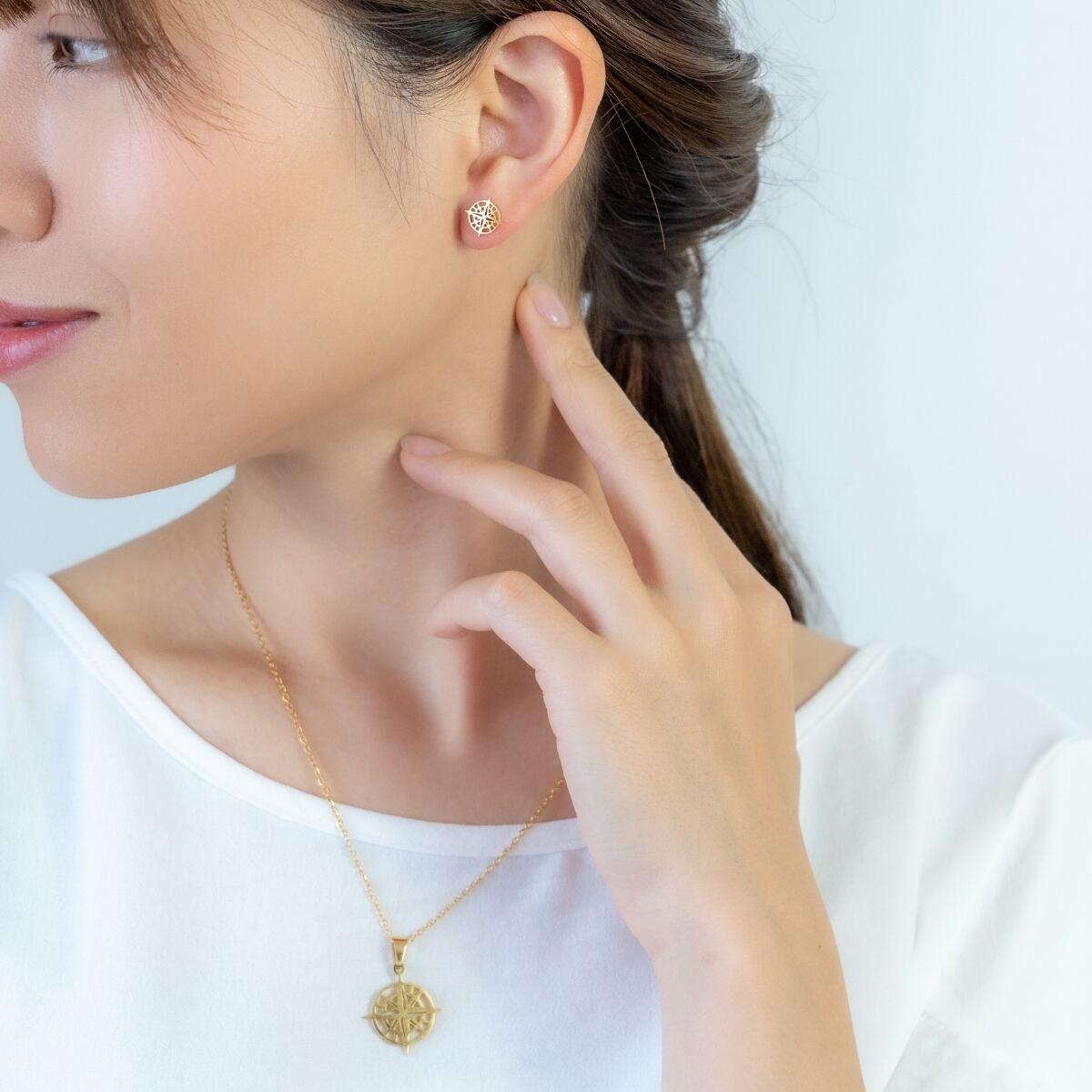 胸元と耳元に揃えて身につければ、コーディネートにアクセントをプラス。
