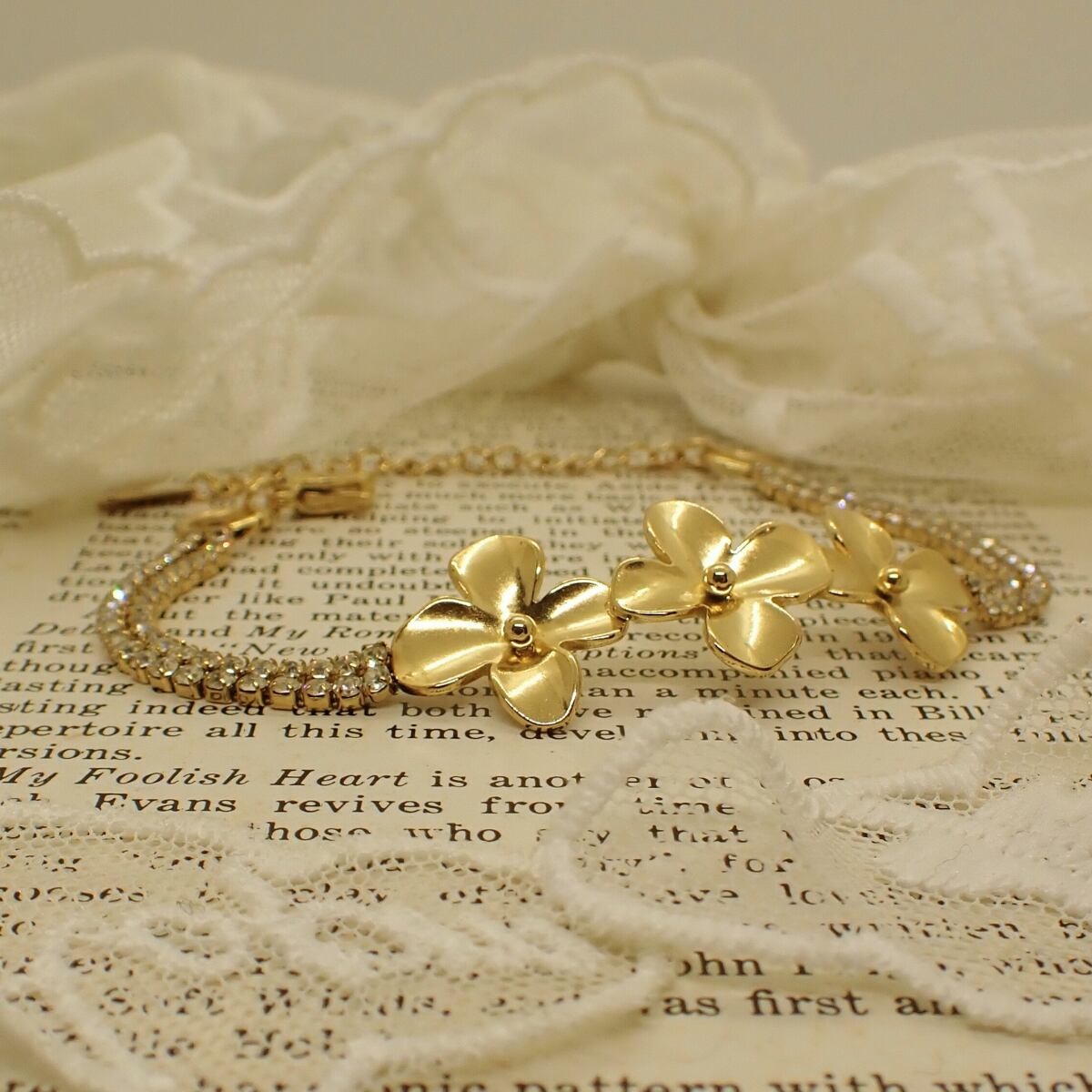 華奢なラインストーンチェーンとゴールドフラワーがきらめき、