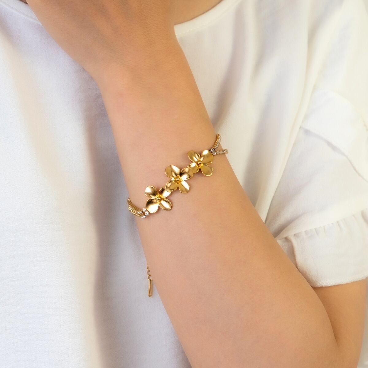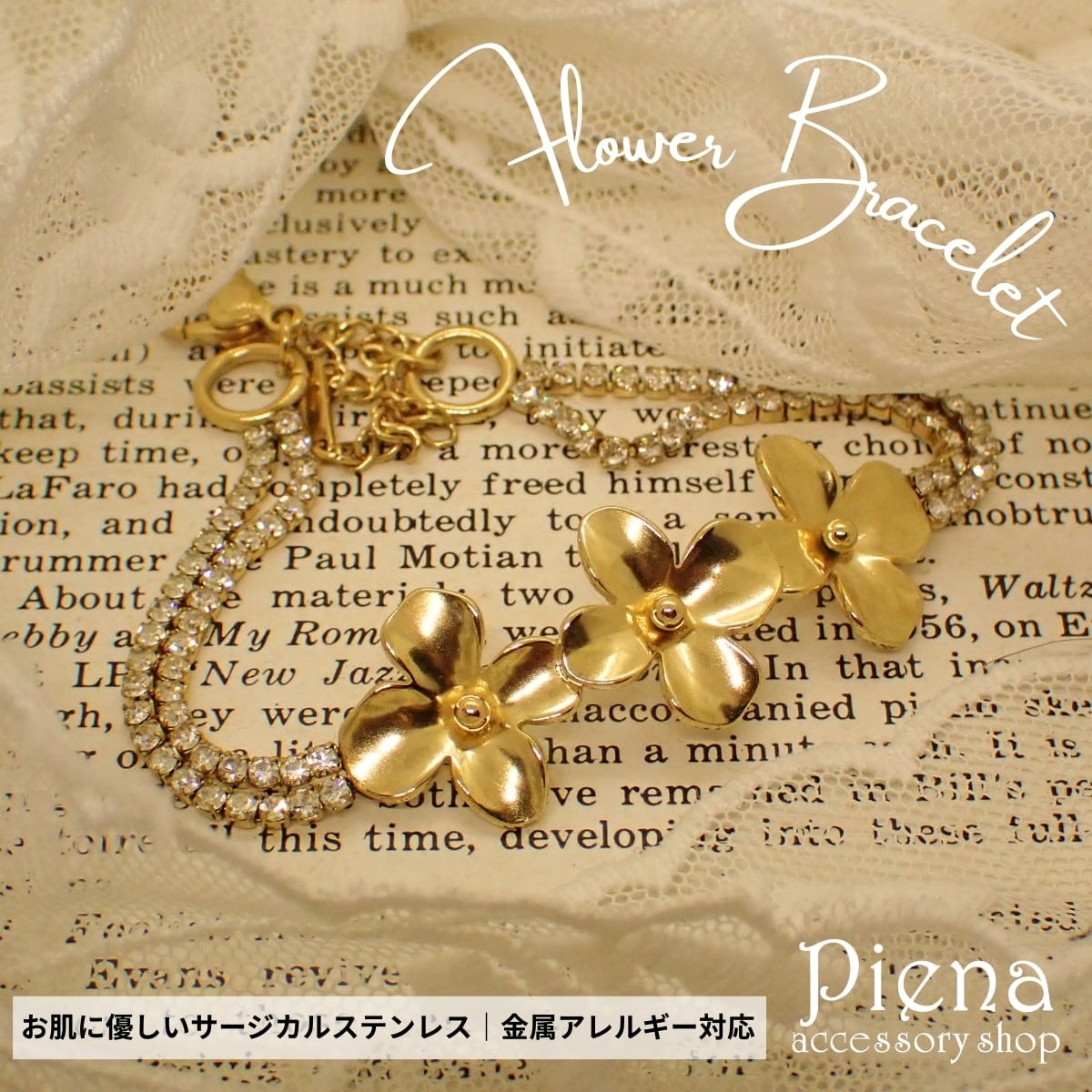 ブレスレット フラワー レディース ali-2301101 サージカルステンレス 華やか ゴールド 花 モチーフ ビジュー付き 2連 チェーン お肌に優しい 金属アレルギー対応 記念日 誕生日 メール便送料無料