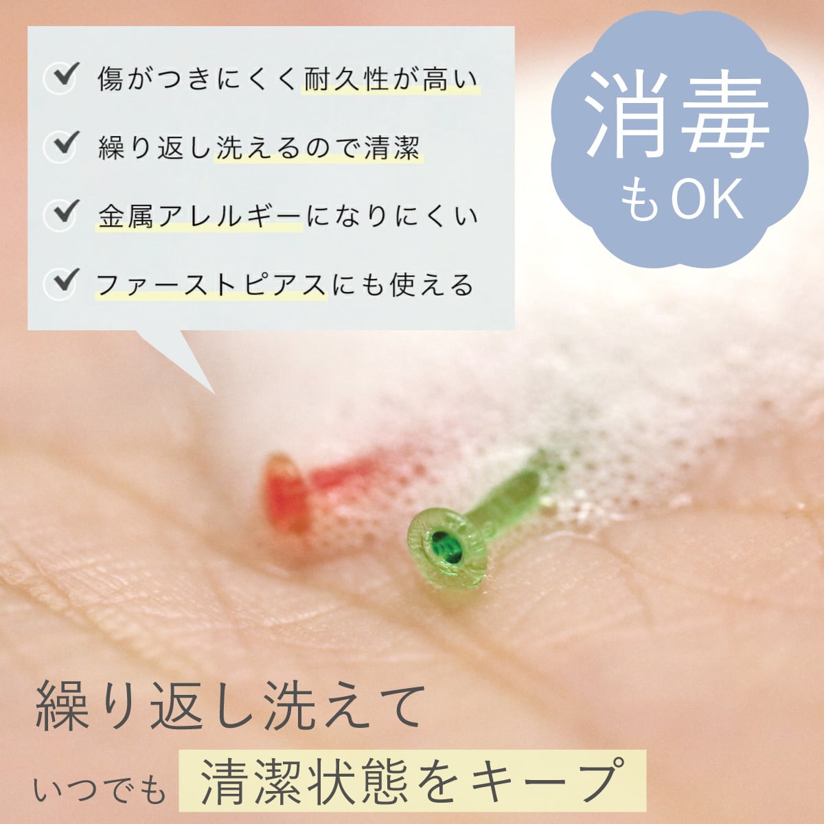 本体は耐熱性強化ガラス、キャッチはシリコン製なので金属アレルギーの方でも安心してお使い頂けます。