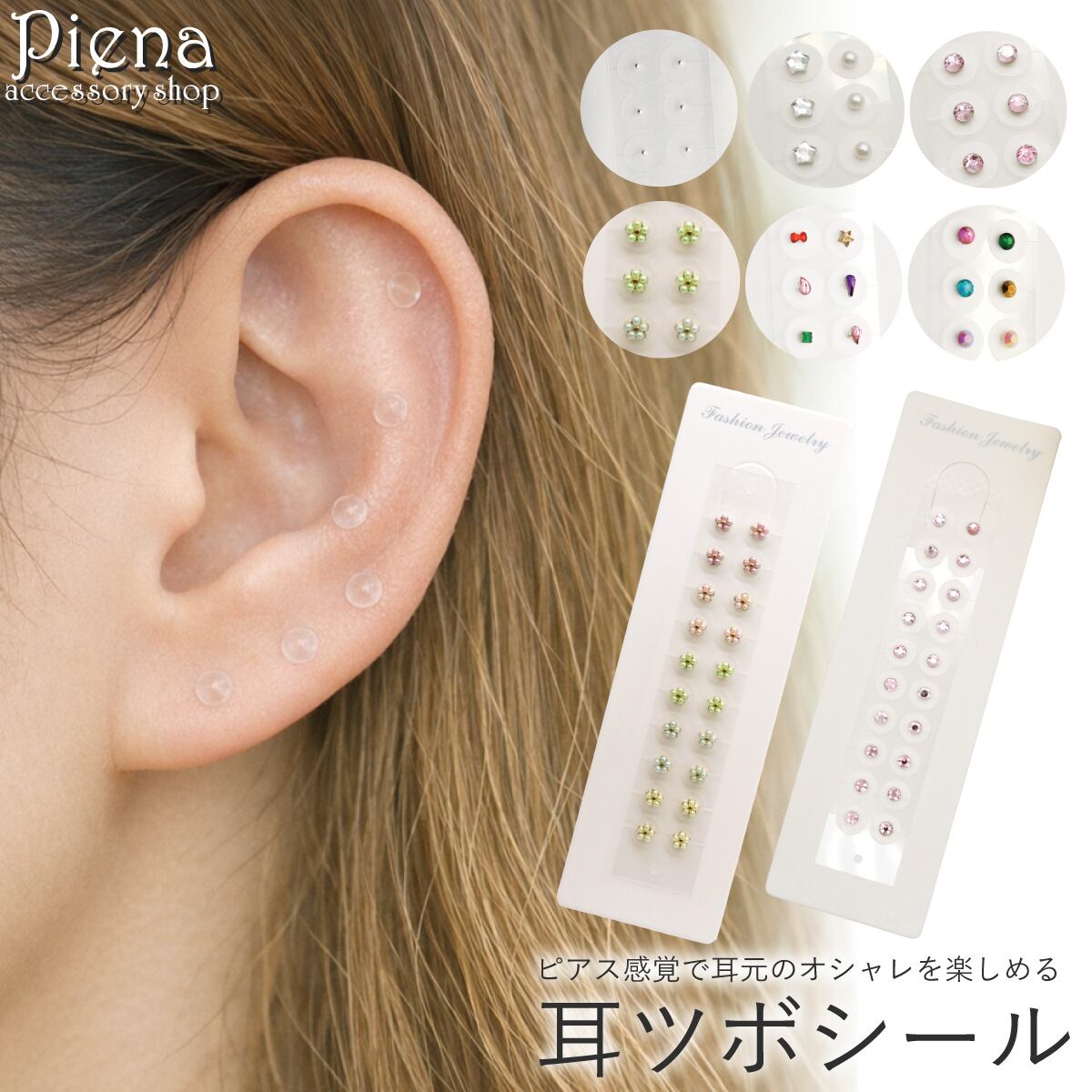 小さな粒付きシールが耳元にフィットし、