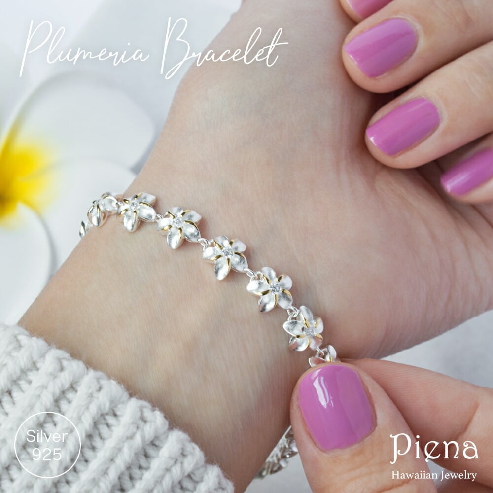 ハワイアンジュエリー プルメリア チェーンブレスレット キュービックジルコニア レディース シルバー925 幅8mm 花 フラワー 20連 ハワジュ トレンド 細め 繊細 上品 高級感 普段使い 誕生日 記念日 プレゼント ギフト