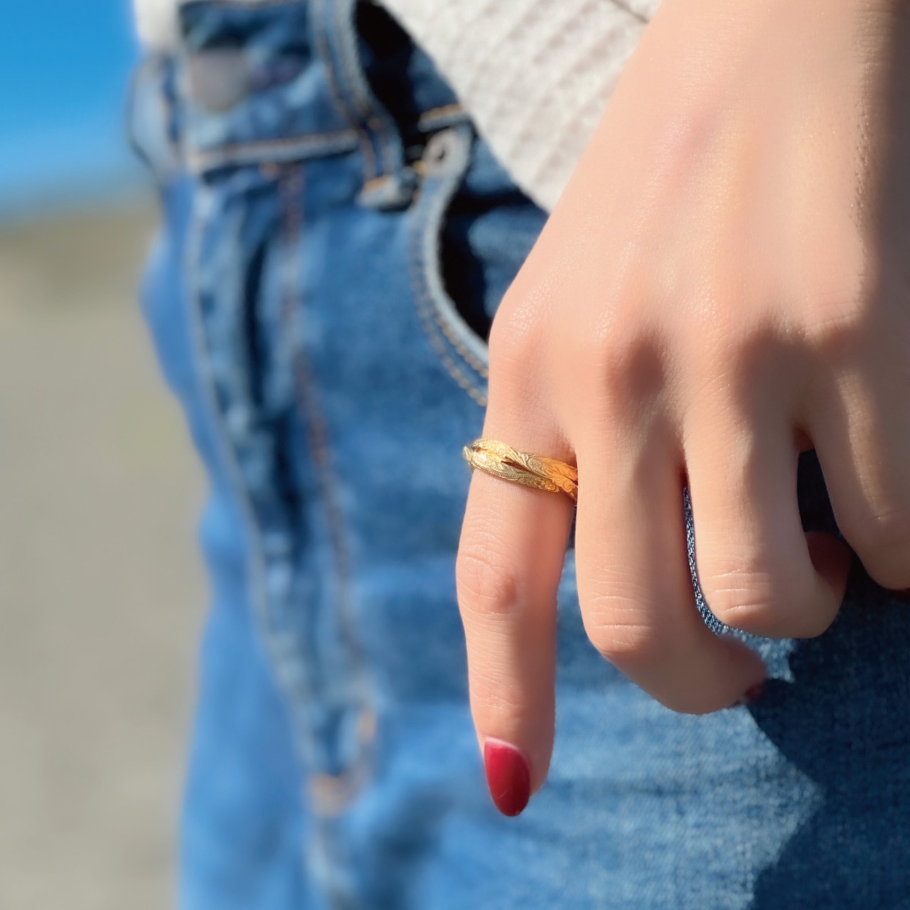 親愛 魅力の意味があると言われているプルメリアと、永遠 幸せを運ぶと言われている波、平和 縁結びなどの意味があると言われているマイレ、3種類のデザインが1つのリングに。