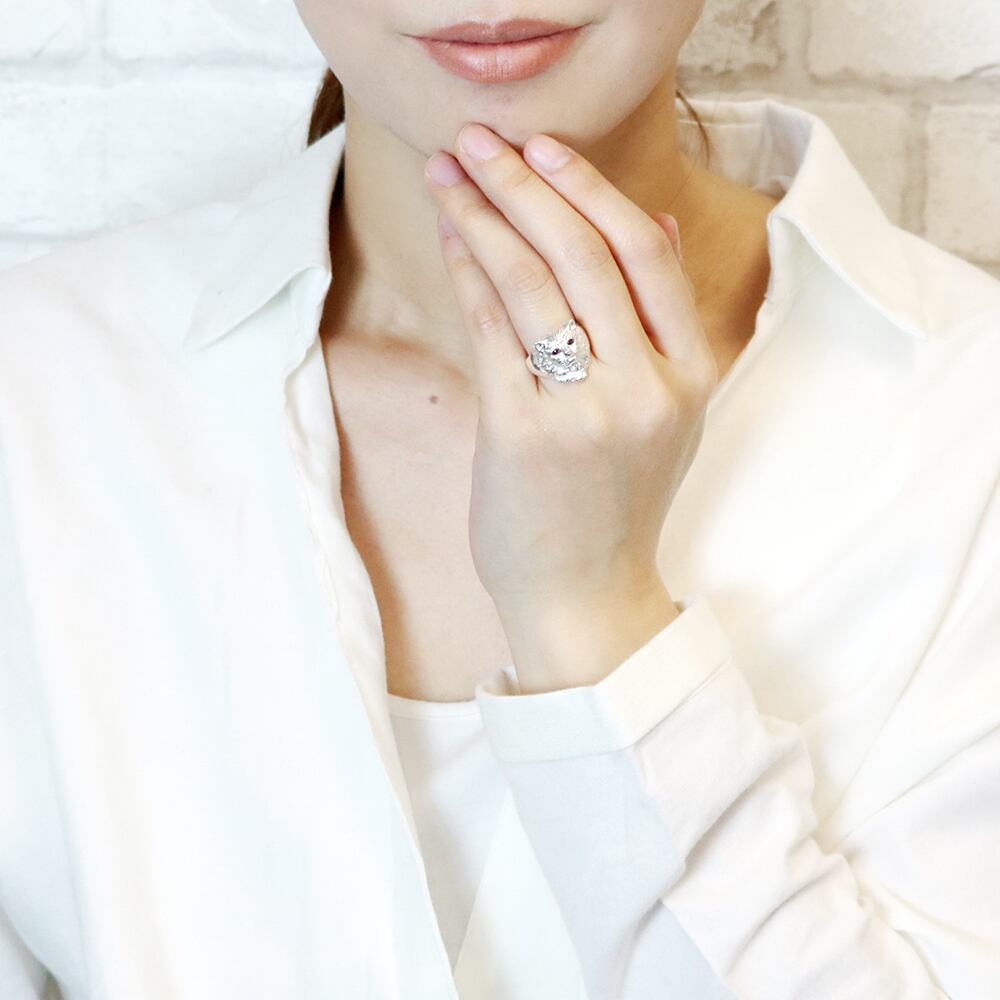 不思議な魅力を放つ猫のリングは、個性的なファッションにも