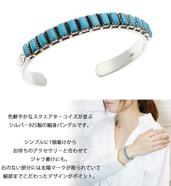 バングル メンズ レディース スクエアターコイズ シルバー925製 細身 太陽マーク ネイティブ アメリカン インディアン 可愛い ブルー トルコ石 レディース プレゼント用にも 送料無料 秋冬 大人気