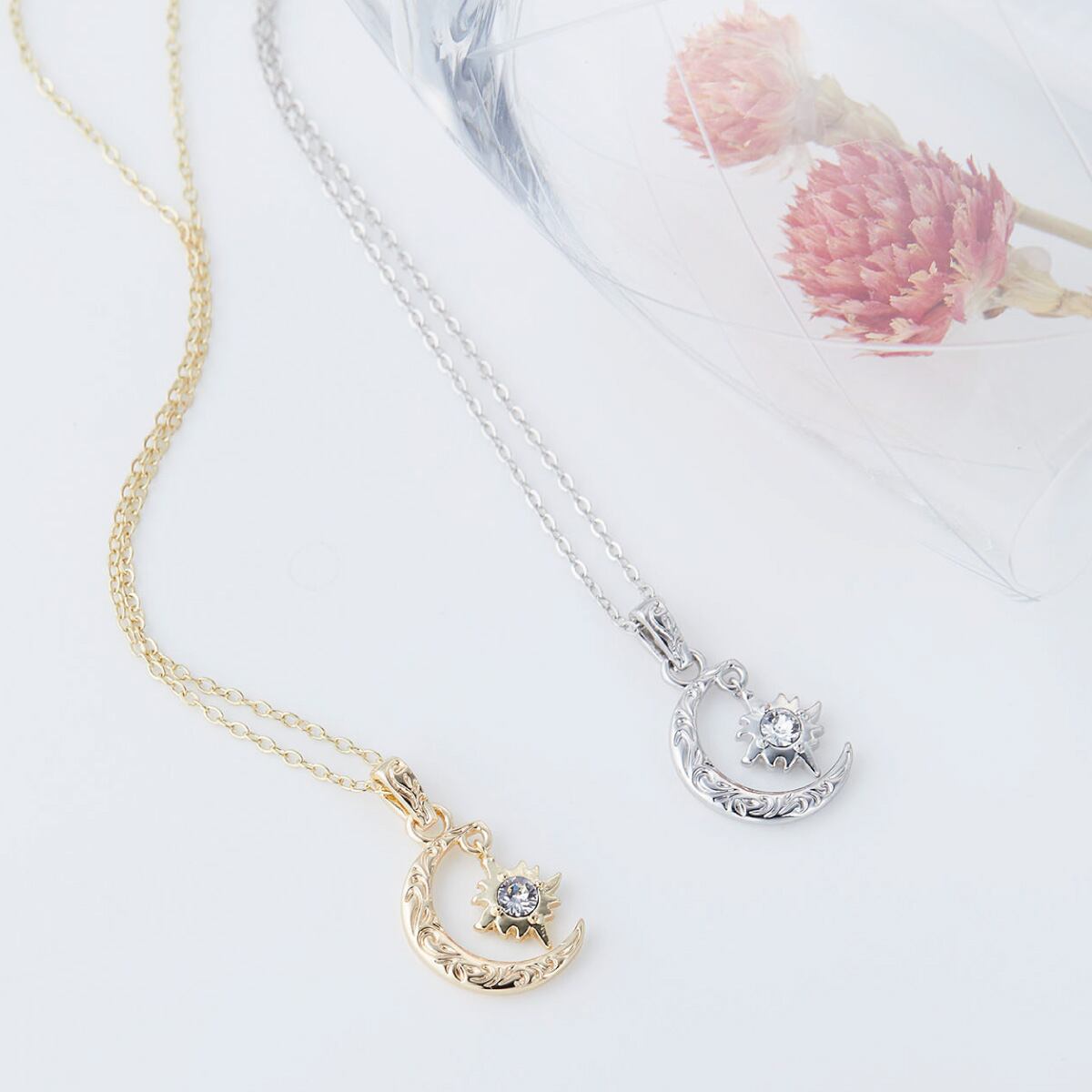仲良く寄り添う、お星様と月のネックレス。