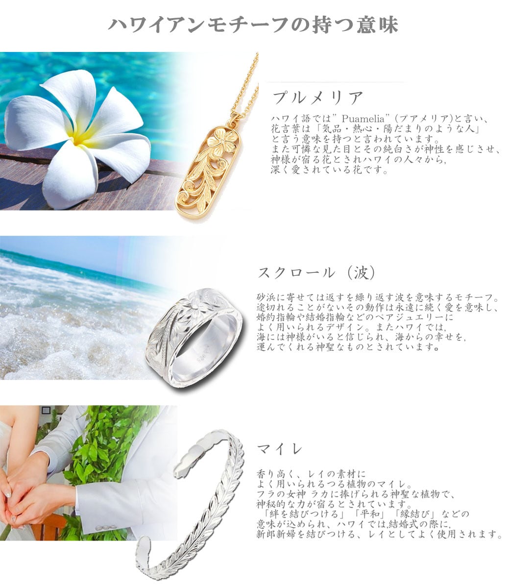 プルメリアやスクロールなど、ハワイアンジュエリー特有の