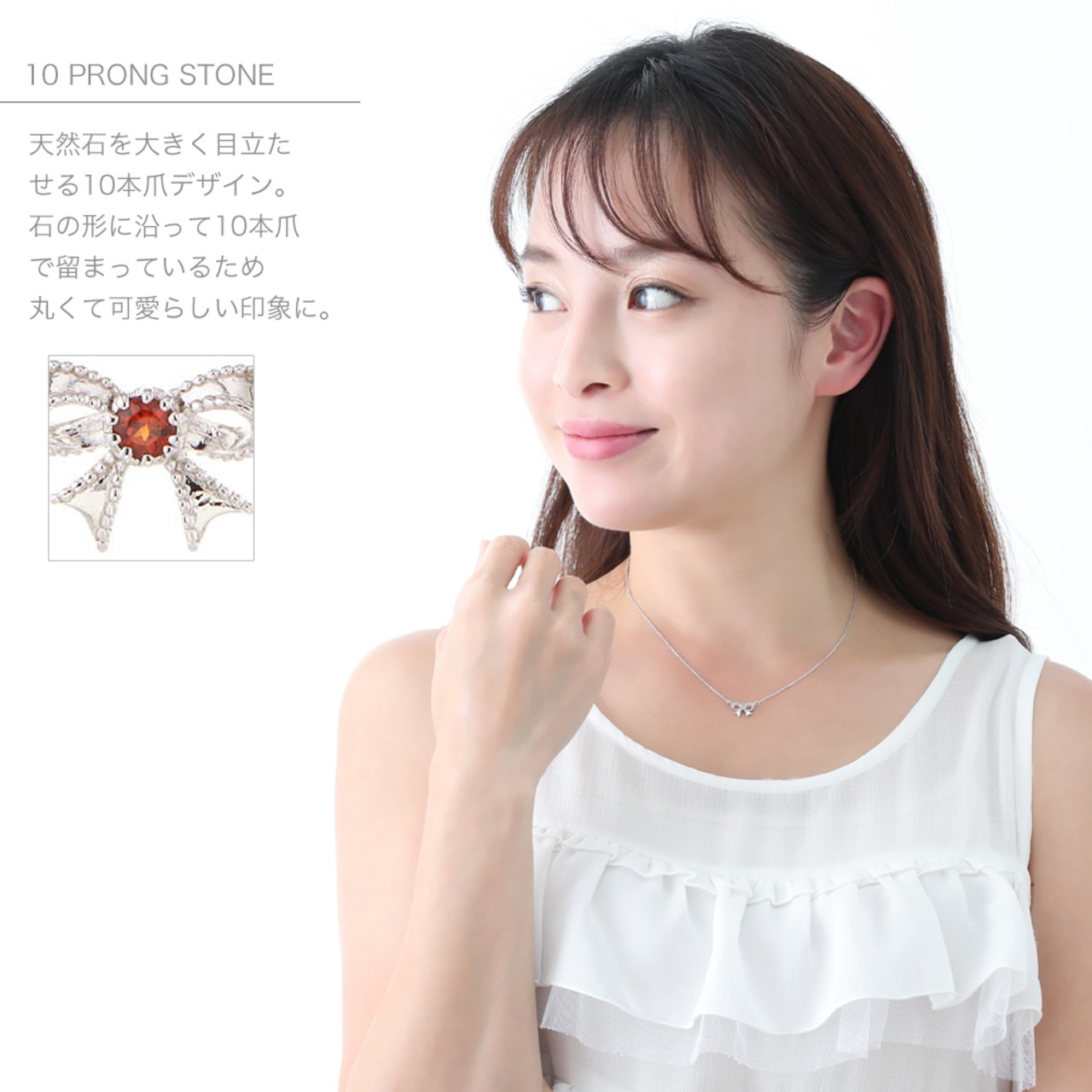立体感のあるリボンとさりげなく輝く天然石が大人の女性にとても馴染む上品なデザイン。艶やかシルバーの光沢と煌めく天然石のコントラストが、肌をワントーン明るい印象に仕上げてくれます。1〜12月までの誕生石が選べ贈り物にもおすすめです。