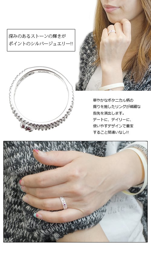 華やかなボタニカル柄の掘りを施したリングが繊細な指先を演出します。