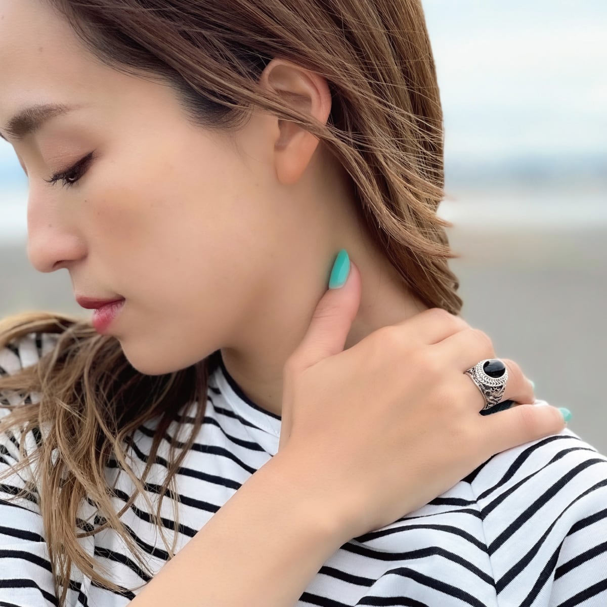 漆黒に輝く大粒のオニキスが際立つ大ぶりなリング。
