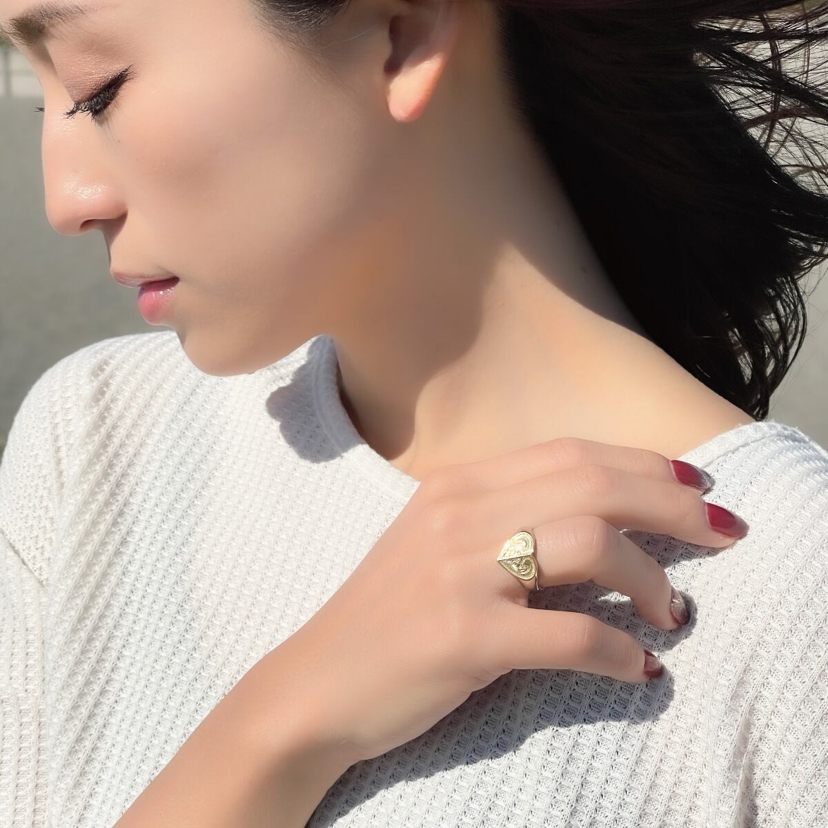 重厚感のあるメンズライクなシルエットですが、印台部分をハートに仕上げた事で、ハードになり過ぎないよう女性らしいデザインに仕上げました。