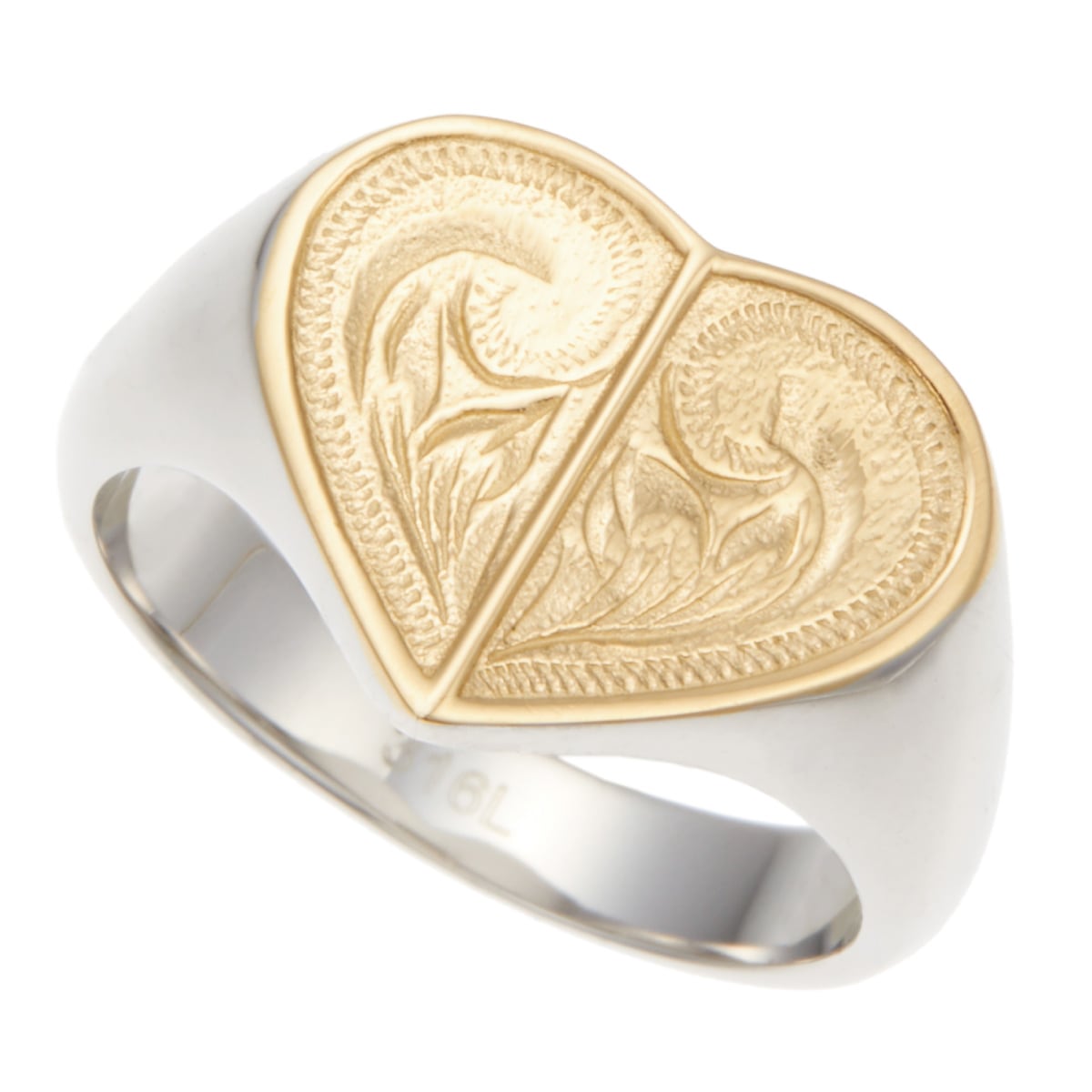 繊細なハワイアン柄がほどこされたハートモチーフのシグネットリングです。
