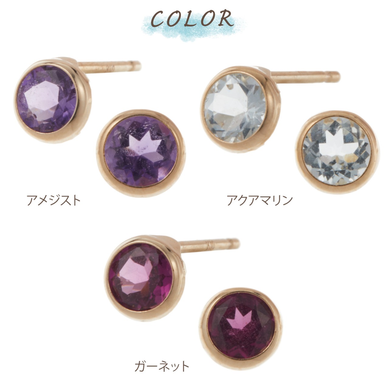 ピアス レディース isi-778274-120 日本製 10金 K10YG イエローゴールド 覆輪 ラウンド 天然石 アクアマリン ガーネット アメジスト 一粒 一石 ワンストーン ギフト メール便送料無料