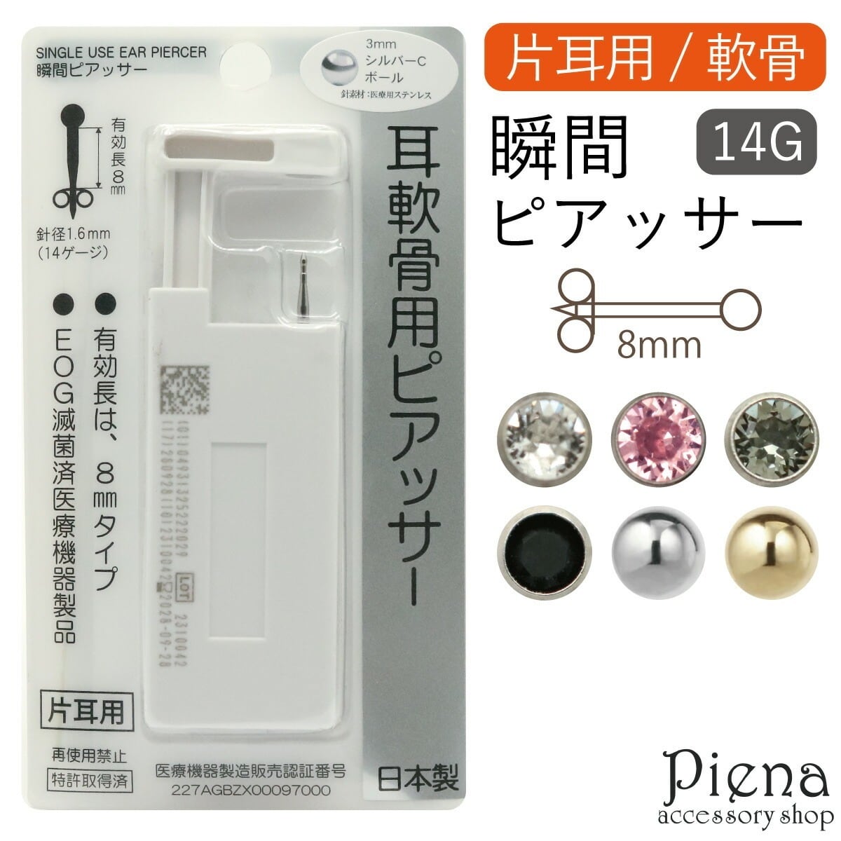 軟骨用 瞬間ピアッサー シルバーC 片耳用 1個売り 日本製 サージカルステンレス製 14ゲージ ポスト有効部分 8mm ロングタイプ 丸玉 一石 一粒 ラインストーン お肌に優しい 金属アレルギー対応 金アレ プレゼント ギフト